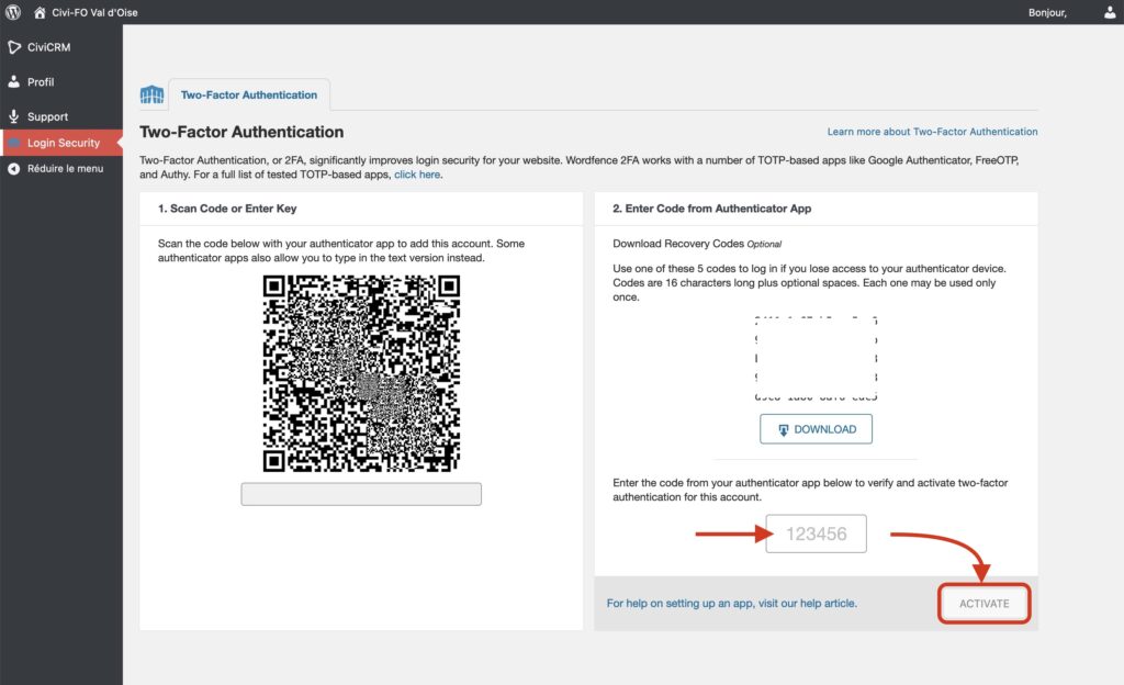 Copier et coller ou recopier le numéro dans le champ [123456] à droite en bas de la fenêtre, puis cliquer sur ACTIVATE.
